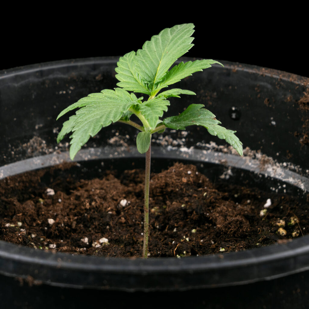 À la fin de la première semaine, notre plante mesurait 9 cm de haut et présentait des cotylédons petits mais sains. Après le premier arrosage, nous avons continué à l’arroser quotidiennement avec 100 ml d’eau (pH 6,0 ; EC 1,4) mélangée aux nutriments liquides Bio Grow. À la fin de la semaine, des racines sortaient du cube de laine de roche et il était temps de transplanter notre plante dans son nouveau pot en plastique de 8 litres et de l’exposer à notre lampe de 1000 W.