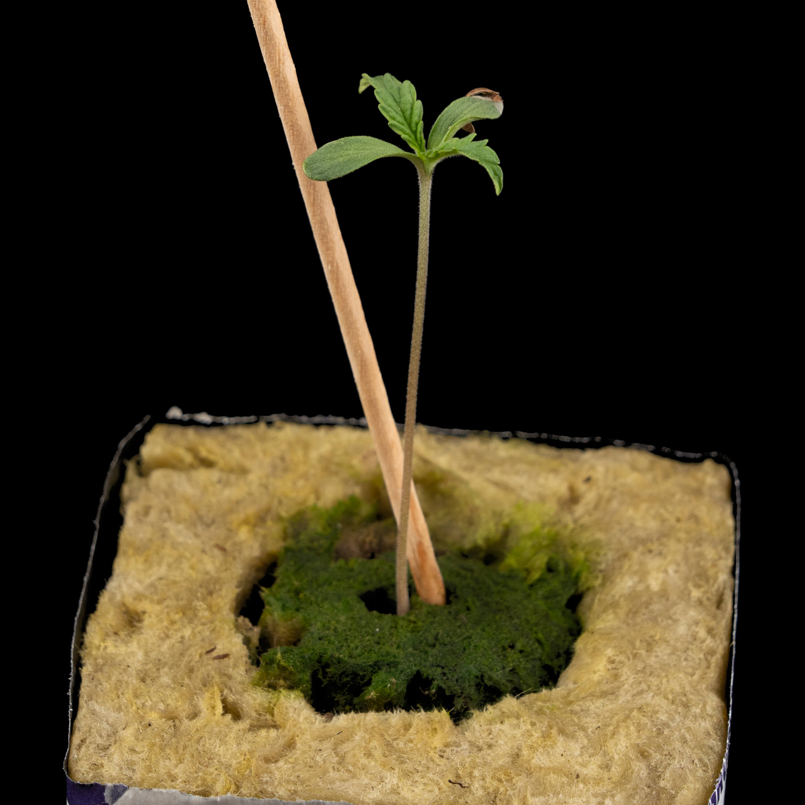 À ce stade, nous avons placé notre graine (racine pivotante vers le bas) dans un cube de laine de roche préalablement trempé, puis nous avons placé celui-ci dans un bac sous une lampe DEL de 600 W. À ce stade précoce, un excès de lumière, de chaleur ou d’eau peut causer des dommages irréversibles et même empêcher la graine de germer. Nous l’avons laissée se développer naturellement pendant trois jours, jusqu’à ce qu’il soit temps de nourrir notre plantule pour la première fois avec 100 ml d’eau au pH équilibré (pH 6,2 ; EC 0,8) mélangée à une petite dose d’hormone d’enracinement.